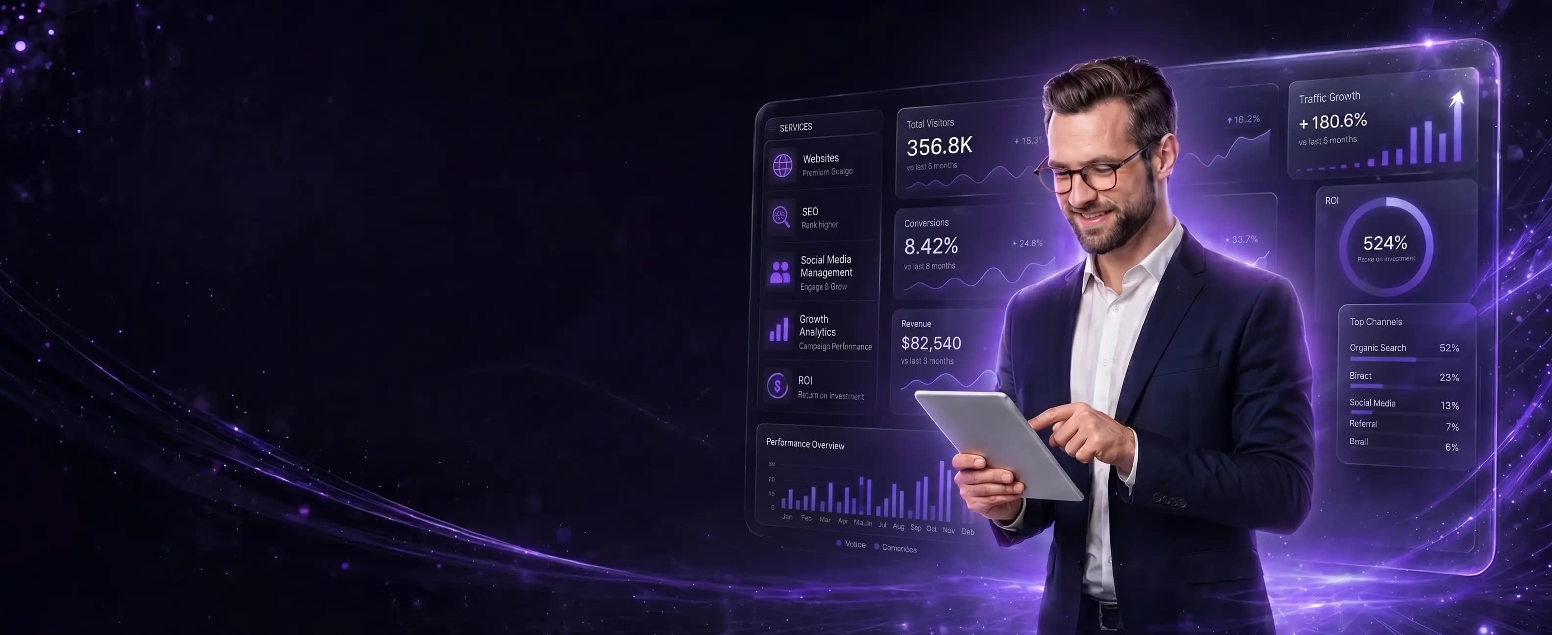 A senior digital team for businesses ready to grow. Web design, digital marketing, SEO, AI automations, and CRM — shipped fast and tied to real numbers.